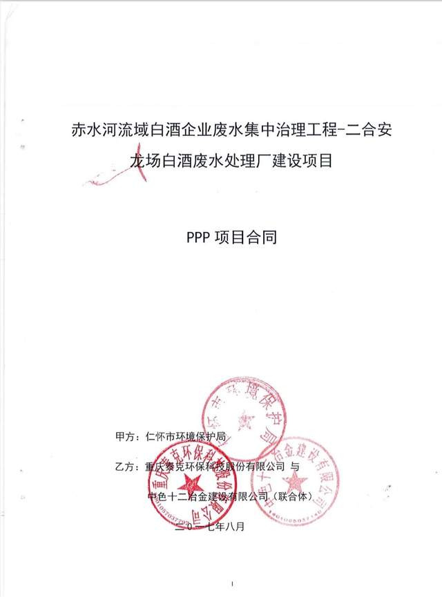 2017年,仁怀市发布PPP(政府和社会资本合作)项目公告,对外招标建设日处理污水1.5万吨的白酒废水处理厂。重庆泰克与另一家央企下属国有子公司组成联合投标体,中标“二合安龙场白酒废水处理厂建设项目”。这家国企后来因自身原因,将其持有股份转让给山西另一家企业。